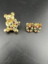 Vintage Unsigned Avon Bear & Wreath Set. Brooch & Earrings. Goldtone