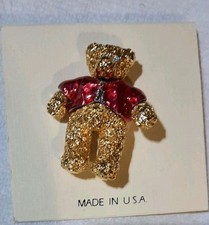 Vintage Teddy Bear Brooch Lapel Pin Rhinestone Eyes Gold Tone Made in USA NOS