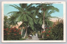 Mid Winter Scene Florida Palm Lined Path Rickshaw Scene Postcard