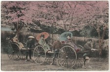 Japanese Ladies in Rickshaws, Vintage Handcolored Postcard