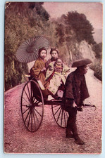 Antique Postcard JAPAN Japanese POSTCARD WITH 3 GEISHA GIRLS IN RICKSHA postcard