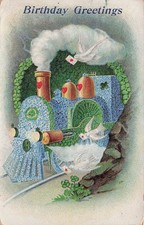 Birthday Card Girl or Boy Playing with a Toy Train Railroad Vtg Postcard I62