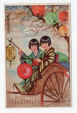 Postcard Children Boy Geisha Girl In Rickshaw Flower Bouquet Umbrella