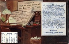 CHICAGO IL Colonial Bank JAN 1910 Calendar Ad LEDGER BOOK TIFFANY LAMP Postcard