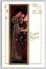 C Ryan~Loves Token~Beautiful Woman Sniffs Flowers~Tiffany Lamp~White Gold Emboss