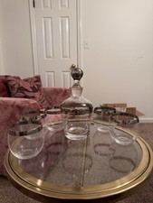 Silver Band Whiskey Decanter 32 oz, Stopper, 5 Roly Poly Glasses Set MCM Mad Men