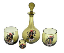 Antique THERESIENTHAL Enameled Olive Green Glass Decanter and Glasses
