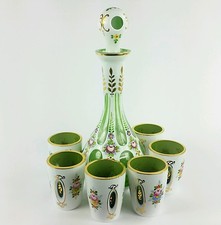 Antique Moser Glass Decanter Set White Overlay Cut to Green