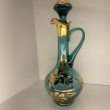 RARE Antique German Bohemian Bottle Green Glass Hand Painted Gold Trim Decanter