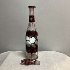 Vintage Possibly Antique Bohemian Cranberry Glass Decanter w/ Etched Decoration