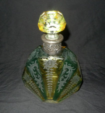 Antique Bohemian Hand Painted Enamel Green Uranium Decanter
