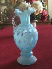 BEAUTIFUL FENTON ART GLASS BLUE COIN DOT 11 INCH VASE WITH CLEAR HANDLE