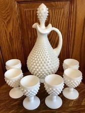 VINTAGE FENTON ART GLASS WHITE MILKGLASS HOBNAIL DECANTER W/6 GOBLETS
