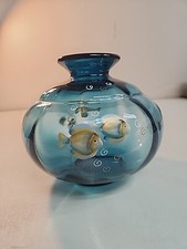 Fenton Indigo Blue Tranquil Sea Hand Painted Fish Vase