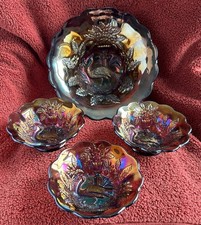 AMETHYST MILLERSBURG PEACOCK AND URN SHINY CARNIVAL GLASS BOWL SET