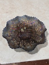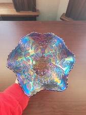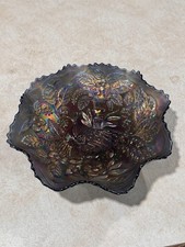 Fenton purple Carnival Glass Peacock & Urn Ruffled Bowl Mint Condition
