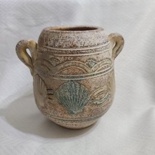Stoneware Vase Double Handle Shell Etched Pattern Jar 6" Vintage Pottery Urn