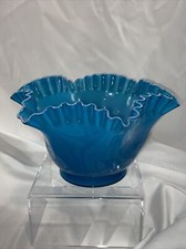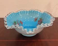 Vintage Fenton Glass Hand Painted Silver Crest Ruffle Blue Bowl With Roses