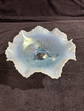Fenton Art Glass Blue Opalescent Hearts & Flowers 11” Ruffled Footed Bowl EXC!