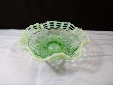 Fenton Opalescent Green Uranium Glass Bowl-Basket Weave & Lace Edge
