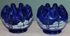 Pair Fenton Winter Scene Cobalt Blue Hand Painted Signed Candle Rose Bowl Vases
