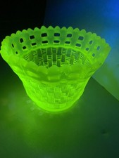 Fenton Green Opalescent Glass 3 Row Open Edge Basketweave Bowl UV GLOWS