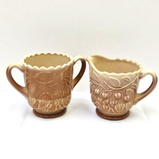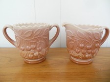 Vintage Fenton Caramel Brown Slag Glass Creamer & Sugar Set Cherries Pattern