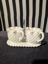 Vtg Fenton Hobnail Milk Glass 6 Pc Creamer Sugar Relish/Jelly Lidded Set w/Spoon