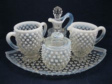 FENTON FRENCH OPALESCENT HOBNAIL 5 PC CONDIMENT, TRAY/CREAMER/SUGAR/MUSTARD/OIL