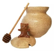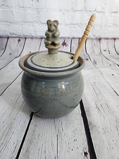 Vintage Honey Pot Jar Stoneware Dipper Teddy Bear Lid Collectible Pottery Signed