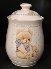 Vintage Tienshan Stoneware Country Teddy Bear Jar Canister w/ Lid 10"