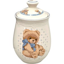 Pottery chocolate treats jar lid teddy bear blue glaze handmade CKB Q