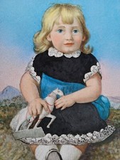 ANTIQUE 19thC VICTORIAN HAND PAINTED GIRL TOY HORSE PORTRAIT WALL PLAQUE CHARGER