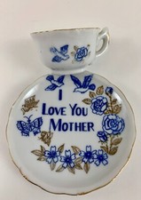 Vintage "I Love You Mother" Childs 2 Pc Toy Cup & Saucer Bluebirds Butterfly 3"