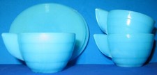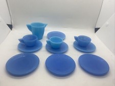 Akro Agate Blue Glass Lot of 11 - 3 Cups 7 Plates Child's Miniature Toy Dishes