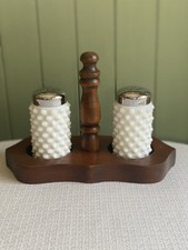 Vintage Fenton Hobnail Milk Glass Salt And Pepper Shaker Set With Wooden Caddy