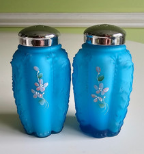Set of 2 Fenton Satin Cased Blue Glass Salt Pepper Shakers Paneled Sprig Margie