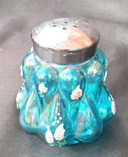 Fenton Carnival Art Glass Salt or Pepper Shaker Blue Cabbage Rose Scallop Base