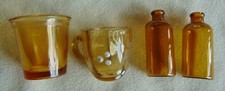 ANTIQUE AMBER GLASS COLLECTION: CHILD'S TOY CUP/HANDLE, CHILD'S CUP & 2 BOTTLES