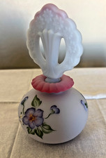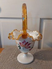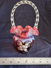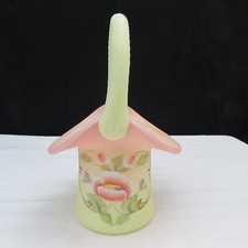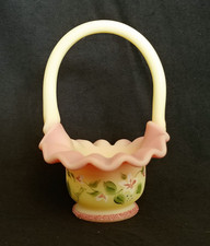 Fenton Hand Painted Art Glass Decorative Basket Pink White Floral Hand Blown