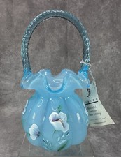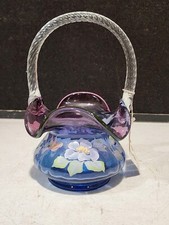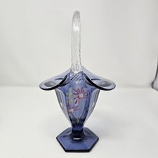 Vintage Fenton Art Glass Violet Hand Painted Flowers Opalescent Basket Signed