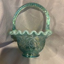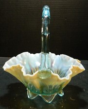 Vtg Fenton Iridescent Opalescent Blue / Green Art Glass Ruffled Basket