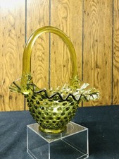 Vintage Fenton Colonial Ruffled Edge Green Hobnail Art Glass Basket