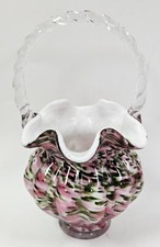 Fenton Pink White Hand Blown Art Glass Decorative Basket with Handles Glossy