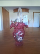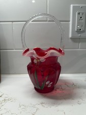 Fenton Art Glass Red Cranberry Opalescent Hand Painted Artist Sig Flower Basket