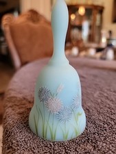 Gorgeous Fenton Art Glass Hand Painted "Frosted Asters” on Blue Satin Bell 1983