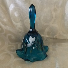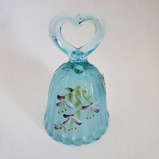 Fenton Art Glass 3 1/2” Hand Painted Teal Bell With Heart Handle Signed