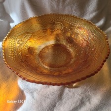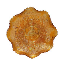 Vintage Fenton Peacock & Urn Marigold Carnival Glass Ruffled Bowl Plate