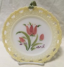 Fenton Custard Satin Glass Handpainted Tulip Reticulated Plate 8"D Decorative