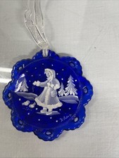 Vintage Fenton Glass Cobalt Blue Ornament Painted White Girl Snowy Scene